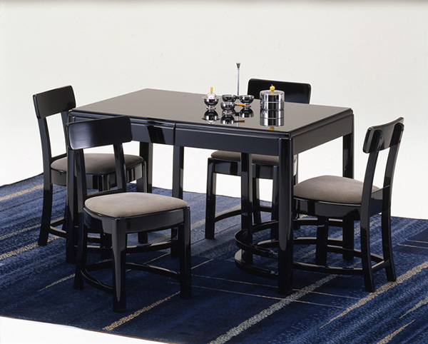 黒ラッカー仕上げのシックなダイニング・セットは1923年に創業したハーマン・ミラー社製。現在、モダンなデザイン家具で世界的に知られる同社も、当初はヨーロッパスタイルのクラシックな家具を主体とし、恐慌下の不況による経営悪化に苦しんだ。ギルバート・ローザの提案したミニマムで生活に密着した新しい家具は、新鮮な驚きをもって受け入れられ、そのモダンさは結果的に家具のみならずデザイン業界にも大きな影響を与えることになった。