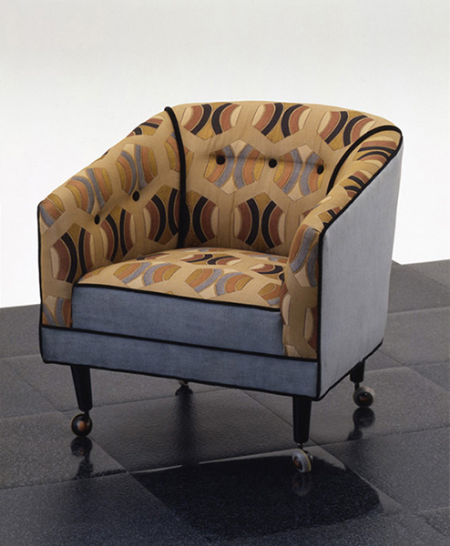 一目でアール・デコ期のパターンと見て取れる幾何学模様のファブリックを張り生地に使ったイージーチェア。生地柄はパターンの組み合わせが複雑で装飾性が高く、比較的ヨーロッパの影響が強かった1930年代初期のもの。椅子自体のフォルムはクラシックなスタイルを継承しながらも、過剰な装飾性をとりのぞいたシンプルかつ実用性が高く、張り生地のデザインとともに新しさを感じさせる。