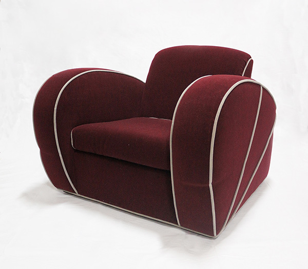 盛り上がるようなボリューム感が印象的なクラブチェア。上流階級の社交場「ジェントルマンズクラブ」を由来にしたアームチェアの呼び名はフランスから始まり、アメリカでも使われるようになった。流線型の流行を感じさせるデフォルメされた丸いフォルムと、そのフォルムを強調するかのようなライン使いが特徴。アーム部分の側面には放射状のラインがよりモダンなデザインポイントとなっている。