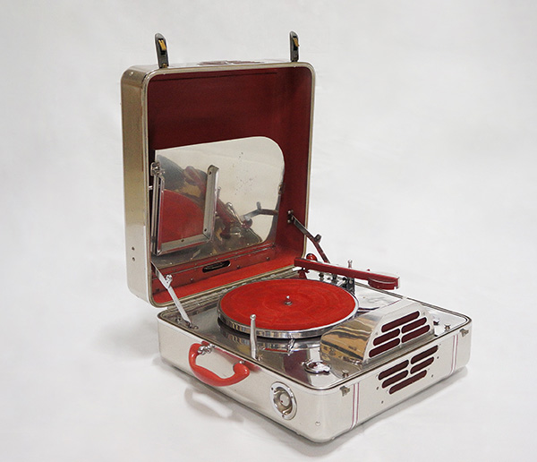 丸みを帯びたシルバー色のケースが近未来的な印象の携帯蓄音機。ニューヨークのRCA社が製造したもので、軽量化を図るためアルミニウムで作られている。銀色に輝く金属色と赤色のカラーリングも鮮やかで内側の鏡により、離れた場所からでもレコードが回転している様子が見て取れる。人の集まる場所で使われることを想定し、視覚的な効果も狙ったデザイン。