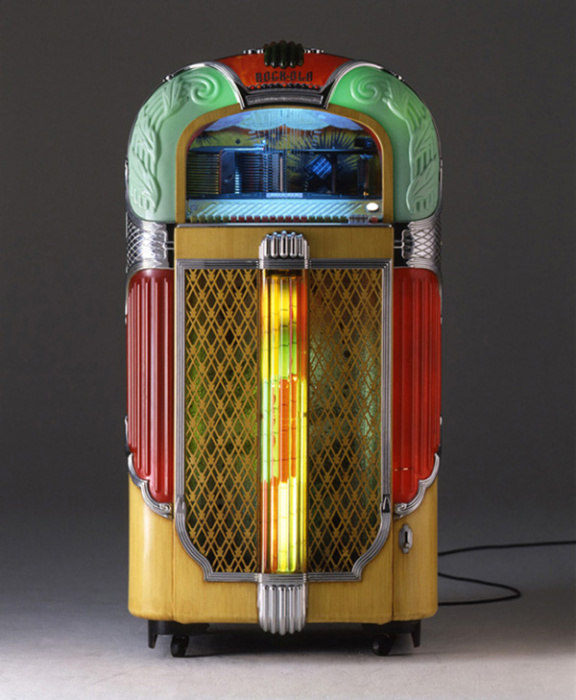 1930年代に登場したジュークボックスはまだレコードプレーヤーが高額な中、コインの投入でレコードを自動演奏する装置としてアメリカのどんな街の酒場や食堂にも置かれる存在となり、1940〜50年代にかけレコード産業の急成長に貢献した。演奏時にはライトアップされるデコラティブな装飾パネルが華やかな1950年代近くのモデル。