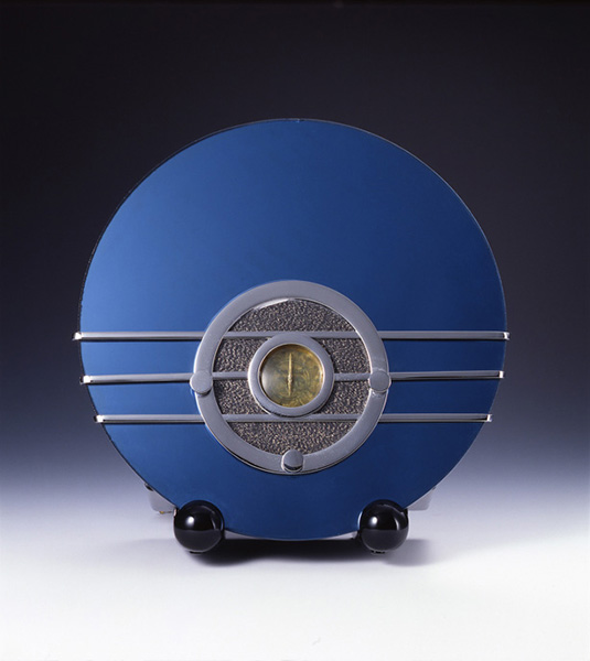1930年代に大流行したコバルト・ブルー・ミラーを使用した美しい丸型ラジオ。同じ素材で流線型のスパートン・ラジオも生産されている。こうした大型で装飾的なラジオは一流ホテルのスイート・ルームや高級クラブのウェイティング・ルームなどに置かれた。コバルトを使用した青い鏡は、1940年代に入ると大戦の影響により軍事資源として使用禁止となったため、わずかな期間にしか生産されなかった。青い輝きは化学技術の進歩や近未来を感じさせる人気の素材だった。
