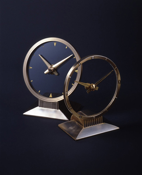 時を示す針が宙に浮いたように見え、一見どうやって時を刻むのか分からない不思議な時計は、ミステリー・クロックとも呼ばれた。一点はフレームにすっぽリ隠されたギアがベース内部のモーターで回転し、連結された長針と同時に、ガラス中央の小さなギアを通して短針を動かす仕組み。もう一点は仕組みが異なりガラスそのものが回転し固定された長針もあわせて動く。機能だけでない楽しさを狙った商品。