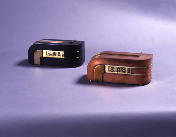 「スラッグ・クロック」とは、なめくじ(slug)のような形からきた愛称。メタリックな質感と個性的なフォルムは1930年代に一世を風靡した流線型列車「バーリントン・ゼファ」にも似て「ゼファ・クロック」とも呼ばれる。ドイツ出身のデザイナー、ケム・ウェバーは、第一次大戦を機にアメリカに移住。ヨーロッパで学んだ知識を元に新しいデザインを次々と生み出し、中でも当時の新素材の金属の使い方が巧みだった。