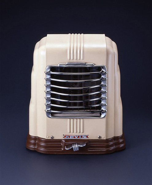 ラジオのような形をした温風ヒーター。小型のベビー・ラジオを得意としたアーウィン社製で、スタイリングには幾何学的な階段状のアール・デコ様式を用いている。一般家庭や照明への配電は、1910年代にはアメリカ国内の配電比率の25%程度だったが、1930年代には40%にも達した。家庭でも当たり前にさまざまな電化製品が使われるようになり、電気による暖房機も広く普及した。