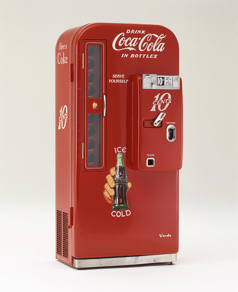1940年代のコカ・コーラの自販機。1886年、アトランタの薬剤師により発明されたコカ・コーラは当初は強壮剤として売り出され、1903年、禁酒運動の高まりからアルコール成分を無くした清涼飲料水として販売を開始。1930年代には真っ赤なブランドカラーとロゴをコーポレートアイデンティティ(CI)として展開し、二つの大戦を経て世界中に認識され、アメリカ文化の象徴となった。