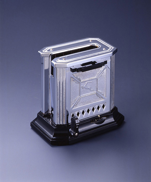 加熱型調理器具の代表選手、トースターは家電製品の中でも初期に開発され幅広く普及した。ゼンマイが内蔵されたポップアップ式トースターの原形。1920年代後期に生産され、細かい幾何学模様とガゼル(レイヨウ)モチーフが見て取れる。ガゼルはフランスのアール・デコ期で人気のモチーフであり、アメリカのデザインがこの時期にはまだヨーロッパの影響を強く受けていたことを示している。