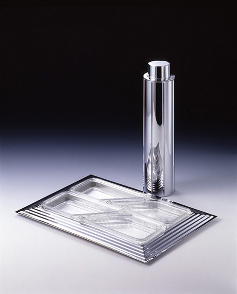 ノーマン・ベル・ゲデスは1930年代を代表するインダストリアル・デザイナーの一人。乗物などの工業製品からキッチン製品まで幅広い分野のデザインを手掛けた。当時優れた金属製品を数多く手掛けたリヴィアー社から発売されたこのシェーカーセットは、これ以上ない程シンプルなフォルムに1930年代ならではの階段状のラインが効果的な美しさで使われ、華やかなスタイリングとなっている。