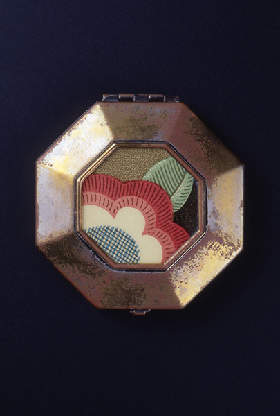 アール・デコの特徴的な幾何学パターンをフォルムに取り入れたコンパクト。花柄のモチーフで可愛らしい印象にまとめられている。1920〜30年代、女性を取り巻くファッション産業は飛躍的な発展を遂げた。女優が使った化粧品や身にまとったファッションも映画やマスコミを通じて一般女性の流行となり、日常的に化粧をする習慣も女性の社会進出とともに広がった。