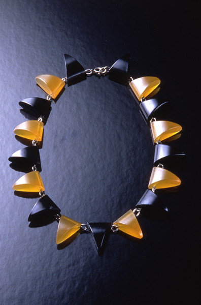 マーブレットと呼ばれた透明感のあるのプラスチックでできたドレッサーセット。マーブレットは別名カタリンとも呼ばれ、大理石風の柄を出すプラスチックとしてもも使われた。1920〜30年台はこうしたさまざまなプラスチックが次々と開発された時代でもある。立体的な三角形の幾何学形態、琥珀色とアジアの漆を思わせる漆黒とのコントラストの効いた組み合わせはアール・デコ・スタイルの特徴を示す。
