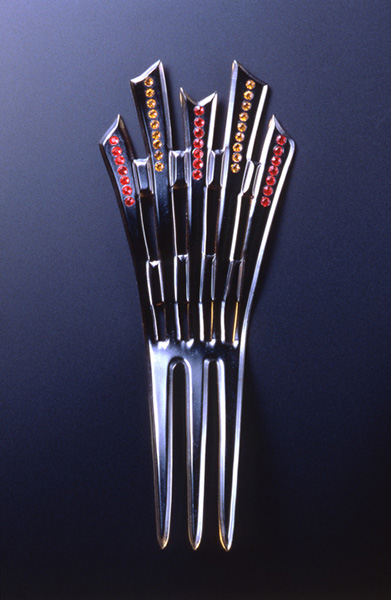 世界で最も早く開発されたプラスチック素材、セルロイド。成形のしやすさや色彩の表現力などでアメリカでは1920年代に入り、アール・デコの流行とともにさまざまなアクセサリーにも使用された。アール・デコ期ならではの大胆な幾何学模様をベースに、カラフルなラインストーンをあしらい、オブジェのようにモダンな髪飾り。艶のある黒色はアジアの漆をイメージしたものであろう。