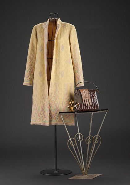 抽象的な柄と幾何学模様を組み合わせ、織り込んだ女性用コート。スタンドカラーの衿裏、前たて部分には同型色のストライプ柄があしらわれ、着用時にわずかに見えるデザイン。ピンクなど甘めの色調がシャープな織り柄とシンプルなフォルムですっきりと新しい印象でまとまり、当時の色彩感覚が伝わる。雑誌などメディア広告も発達した1930年代はファッション産業がかつてない発展を見せた。