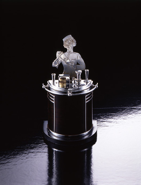 バー・カウンターをモチーフにし、趣向を凝らしたデザインのオイル・ライター。カウンターの左からふたつめのノブの下に、長さ5㎝ほどの棒がつながり、オイルがしみ込んだ先端を、左となりの突起(発火ボタン)に押し当てて火を点ける。オイルを使ったマッチのような仕組み。人気のシリーズでモチーフが男性バーテンダーのタイプも製造、販売されている。