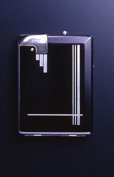シガレット・ケース兼ライター。上のボタンを押すと、タバコが1本飛び出し、左の金属の蓋が開いて火が点く。シガレット・ケースとオイル・ライターのふたつの機能がひとつになっている。商品名はオートマライター。金属のふた部分と本体にはアール・デコ期の特徴である線状の装飾パターンが見られる。シンプルな数本の線のみで時代の雰囲気が伝わるデザイン。