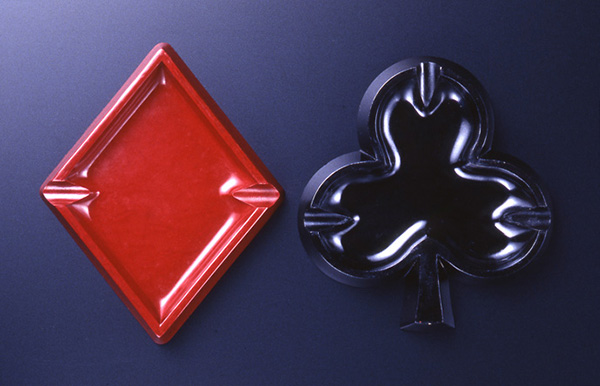 トランプの模様をそのままモチーフにしたベークライトの灰皿。プラスチックを型で成型しトランプの形をつくっている。このほかにハート型、スペード型も制作された。1920〜30年代に新素材として数多くの生活用品に登場したプラスチックは、加工の容易さと色彩表現の豊かさが魅力で、こうした遊び心あるデザインにも適していた。ポーカーやブリッジをするときに各自に配られ人気を集めた。