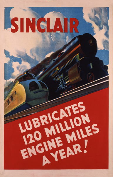 モーターオイルメーカー“SINCLAIR“にのポスター。単純明快なレイアウトで力強く描かれた手前の流線型列車はユニオンパシフィック鉄道のM10000シリーズ。20世紀初頭の技術革新を礎に発展したアメリカの機械産業は、恐慌後のインフラ整備を追い風に、鉄道・航空・自動車産業を時代の花形へと押し上げた。1930年代にはデザイナーと呼ばれる職業の登場とともに流線型が流行し、スピード化は視覚的なスタイリングとして広がったことでより注目を浴びた。