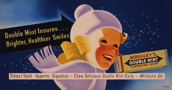 1930年代の商業ポスターには、食品メーカーによる商品ポスターにもデザイナーやイラストレーターが採用され、魅力的なグラフィックが数多く展開された。スポーツやレジャーなどさまざまなシーンで商品を口にする女性を統一したイメージで表現した連続シリーズのポスター。オーティス・シェパードによるガムシリーズの広告は人気を集め、商品展開とともに数多くのバリエーションが制作された。