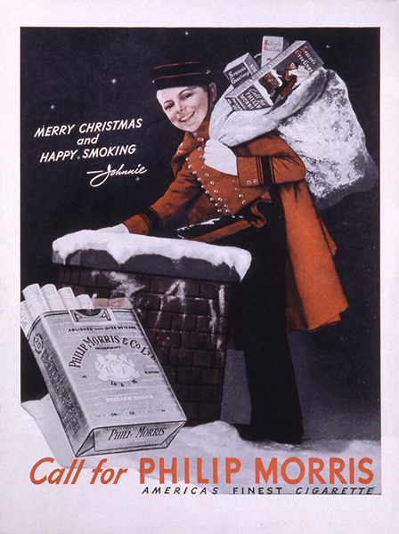 (LIFE 1938年12月19日号掲載)「PHILIP MORRIS」の雑誌広告。現在では世界最大のたばこメーカーに成長したフィリップ・モリスはイギリスでの開業に始まる。1894年にイギリスで法人化した後アメリカ支店を開設、1919年にはアメリカに拠点を移し、1925年には女性向けの煙草としてマルボロの発売を開始して業績を伸ばした。1930年代のグラフ誌「LIFE」に掲載されたクリスマス広告では、「アメリカ最高級のタバコ」のコピーとともに、フィリップモリスブランドをアピールしている。