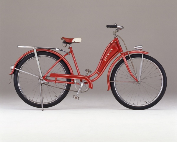 流れるような曲線が美しい女性用の自転車。流線型のデザインは合理性と美しさを兼ね備えた点に人気の秘密がある。人々は、意匠自体の新しさとともに機械技術による新しい時代の到来を感じとったであろう。SCHWIN社は1890年代から続く、アメリカ現存最古の老舗自転車ブランド。美しい曲線のモデルはクラシックスタイルとして現在も形を変え、生産されている。