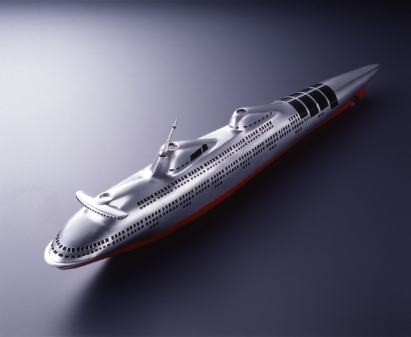 ノーマン・ベル・ゲディスが著書「ホライゾンズ=地平線」で提案した斬新な未来の交通機関は大きな反響を呼んだ。いずれもスピードの効率化を図った流線型のフォルムが特徴で、こちらは2,900人乗り大型客船「オーシャンライナー」の1/600モデル。フランスのノルマンディ号やイギリスのクイーンメリー号など2,000人級の旅客を運ぶ客船が次々と登場した1930年代、ゲデスのプランは一定の現実味をもっていた。