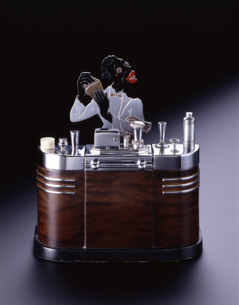 バーテンダーがモチーフの卓上ライター。どこかユーモラスで愛嬌あるデザイン。本体には1930年代に流行した流線型の特徴である丸みをおびたフォルムと流れるような線状の装飾が施されている。ほかに女性のバーテンダーモチーフのバリエーションも製造され、当時人気の品であったことが伺える。