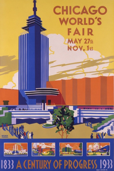シカゴの市政施行100年を記念し1933年に開催されたシカゴ万博の公式ポスター。テーマは「進歩の1世紀」で、過去1世紀における進歩と将来を展望する目的で開催された。わかりやすいテーマを設定した初めての万国博覧会と言われ、シカゴの景気回復、文化都市としての躍進に大きく寄与した。「進歩」のコンセプトにふさわしい明るく、明快なグラフィックが印象的なシリーズポスター。