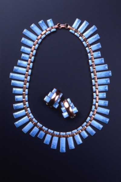 銅に七宝焼きを組み合わせたネックレスとイヤリングのセット。当時流行したジグラット(ピラミッドの階段状)のパターンが特徴的。1930年のアール・デコ期特有のこうした幾何学的なモチーフとカラフルな素材の組み合わせは、モダンなデザインとして人気だった。直線的なモチーフの形状とトルコ石を思わせる七宝焼の色合いは、エジプトやアジアなどエキゾチックな東洋へのあこがれも反映している。