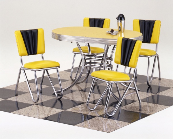 黄と黒の2トーンがおしゃれなキッチンテーブル・セット。カラフルな合成皮革のシートとテーブルの脚部に使われた耀くクローム・チューブはいずれも当時の新素材であり、1950年代に続くアメリカ独自のデザイン感覚をよく表している。耐久性の高さから、類似品が商業施設などでも多く使用された。