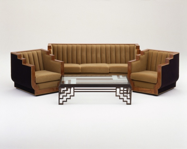 ジグザグ・パターンのデザインが特徴的なリビング・ルーム・セット。階段状のジグザグ・パターンは1920〜30年代にニューヨークに次々と建設された高層ビル群“摩天楼(スカイスクレーパー)”をモチーフにしたもの。道路からセットバックして幾何学的なフォルムでそそり立つビルの形状は、アール・デコ・スタイルの一つとして、家具などの意匠にも多く取り入れられた。