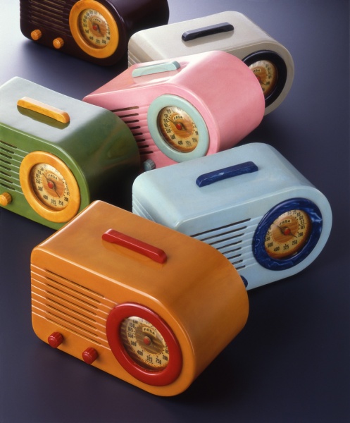 「流線型列車」という名の小型ラジオ。テレビが登場、普及する前の1930年代のアメリカにおいてはラジオが最大のメディアであり、カラフルなプラスチックのラジオは流行の最先端のデザインで人気を呼んだ。家具調のラジオも珍しくなかった当時としては小型で、流線型の丸いフォルムはインテリアグッズとしても愛嬌があり、今なおコレクターの人気が高いデザイン。
