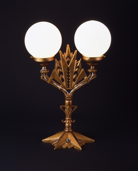 幾何学的な装飾様式を特徴とするアール・デコは1920年代にフランスから派生し、アメリカでの流行も初期にはその流行を追ったものだった。このランプはヨーロッパのデコラティブな幾何学模様を取り入れたもの。1930年代に入り、機械化による産業発展とともにより未来的な流線型が登場すると、こうしたデザインは消えていった。