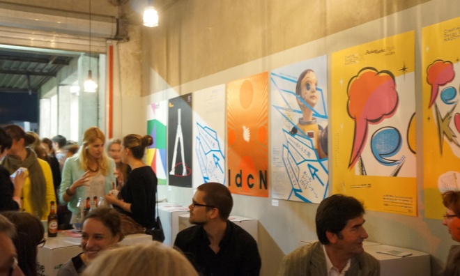 国際デザインセンターとクリエイティブ・デザインシティなごやのポスターと、オープニング来場者ら