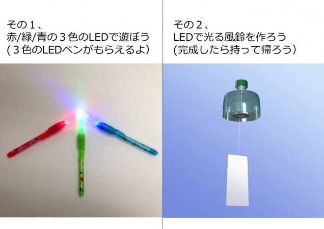 LEDの光の風鈴をつくろう!の前半は、赤・青・緑のLEDの光で遊びながら学ぶ光と色のふしぎ「光で遊ぼう」。3色を並べて手をかざすと3色の影ができ、3色を合わせると、アラ?ふしぎ、今度は色が白くなった!いろいろなものに光をあてて、光と色がどんな風に見えるか試してみた。後半の「光の風鈴をつくろう」では、LED電球とペットボトルで、音のしない光る風鈴を制作。風鈴のたんざくの揺れが針がねに伝わってスイッチがオン、オフ。風の向きや強さで、光る色や、光ったり消えたりが変わる、風まかせで点滅する光る風鈴を作った。