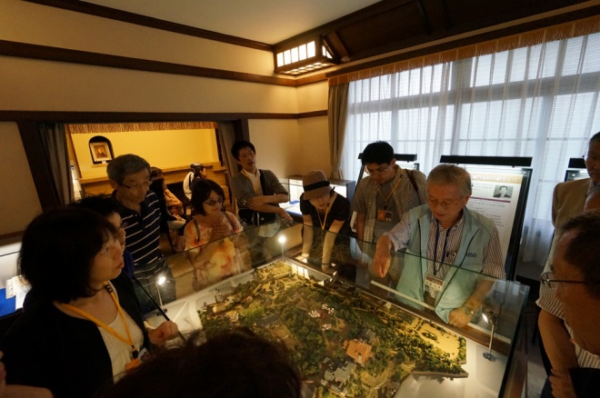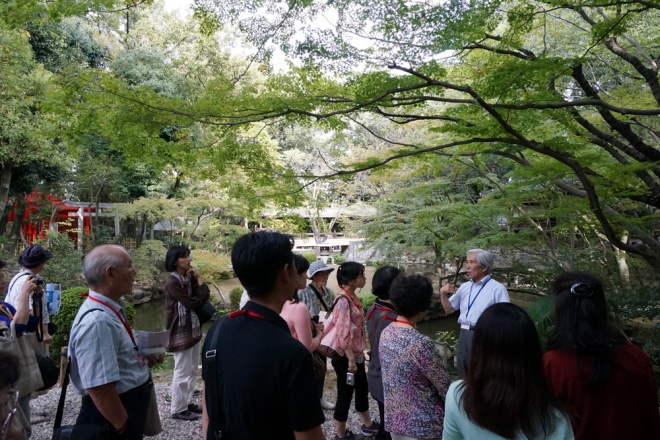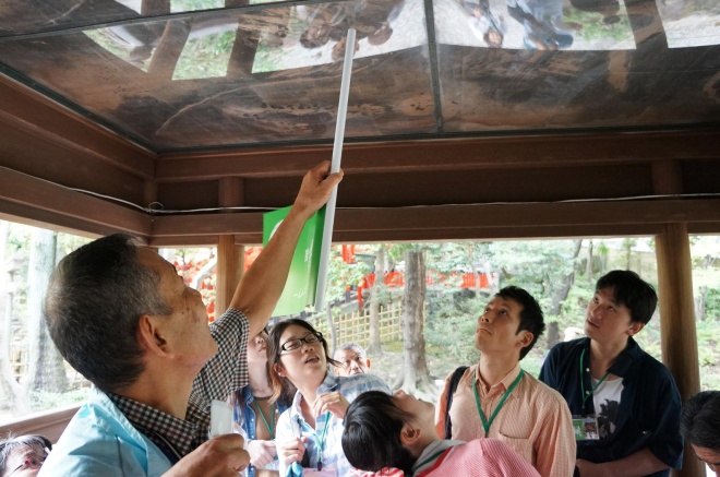 当日は、修復を終え今年8月下旬に公開がはじまったばかりの揚輝荘・南園の「聴松閣(ちょうしょうかく)」を中心に、北園の「伴華楼(ばんがろう)」などと庭園も見学・散策した。今回の見学会は、このツアーのために特に組まれたもので、あわせて約1時間30分とコンパクトな内容ながら、保存・修復に尽力してきたNPO法人揚輝荘の会、愛知建築士会から、特に館長と3人の建築士からガイドを受けられ、応募倍率28倍から抽選で選ばれた41人の参加者が熱心に解説に聴き入る姿が見られた。