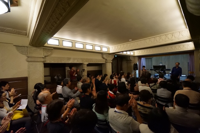 ツアーの締めくくりは、インド様式の意匠がエキゾチックな聴松閣・地階の多目的室(旧舞踏場)で、館長による祐民を中心にした解説とサロン風ミニコンサート(あわせて約1時間30分)。あまり知られていないが、松坂屋の前身であるいとう呉服店が明治44年(1911年)に結成した「いとう呉服店少年音楽隊」が、後に、現存する日本最古のオーケストラ、東京フィルハーモニー交響楽団に発展した。今回のミニコンサートでは、このエピソードを背景に、名古屋フィルハーモニー交響楽団に所属する3人が、揚輝荘にちなんだ10作品の演奏とトークで観客を楽しませた。
