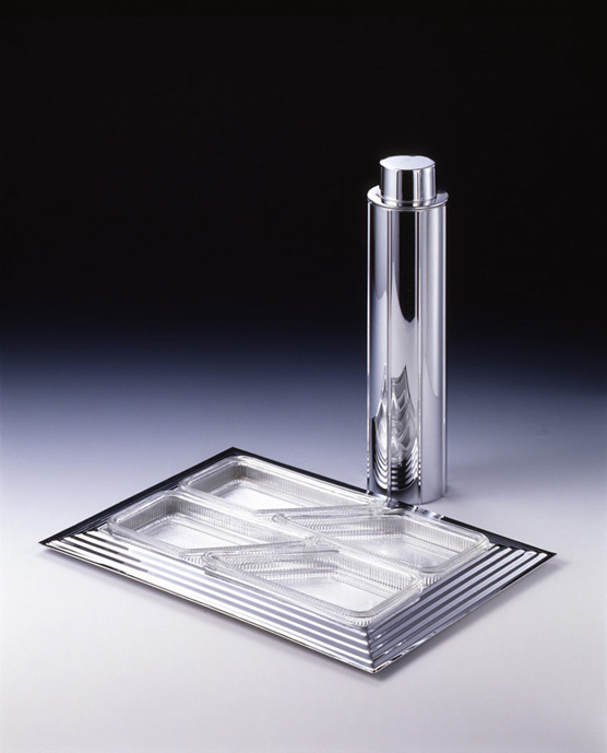 (左)スカイスクレーパー・カクテル・シェーカーとトレイ/1934年/デザイン:ノーマン・ベル・ゲディス