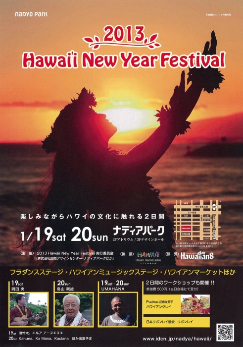 | 主催 | 2013Hawaii New Year Festival実行委員会(株式会社国際デザインセンター・ナディアパーク) |