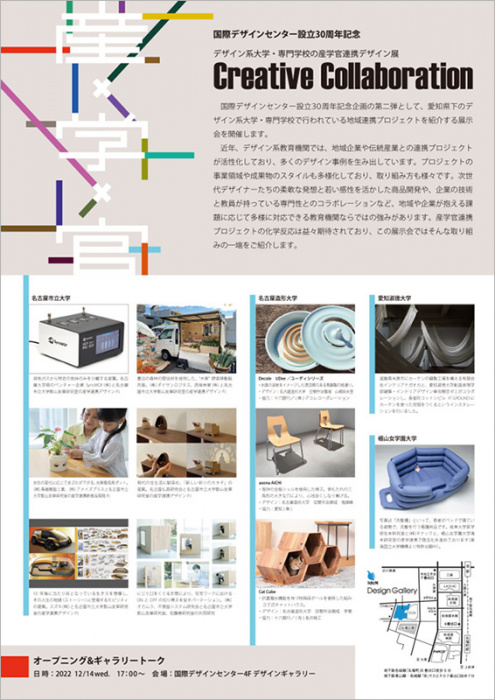 国際デザインセンター設立30周年記念の第二弾として、愛知県下のデザイン系大学・専門学校で行われている地域連携プロジェクトを紹介する展示会を開催。
