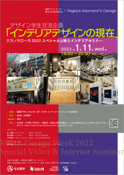 「インテリアデザインの現在」をテーマに、世界最大級の家具・デザイン分野のビジネス展示会“ミラノサローネ2022”のスペシャル映像を上映(企画・プロデュース NOBU ARCHI DESIGN株式会社 代表 成ケ澤伸幸)。世界のインテリアトレンドと展示会の現状を学んでいただくとともに、日本インテリアデザイナー協会(JID)の2021-2022年アワード受賞者をパネリストに招き、受賞作品を通して国内のインテリアデザインの現場を紹介、学生との交流の場を設けます。
