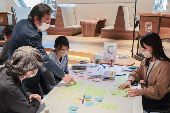 参加企業から事前に募集した課題(テーマ)をもとにした実践的なワークショップ。実際に手を動かしながら、デザイン経営の核となるデザイン思考フローのプロセスが体験できるプログラムです。