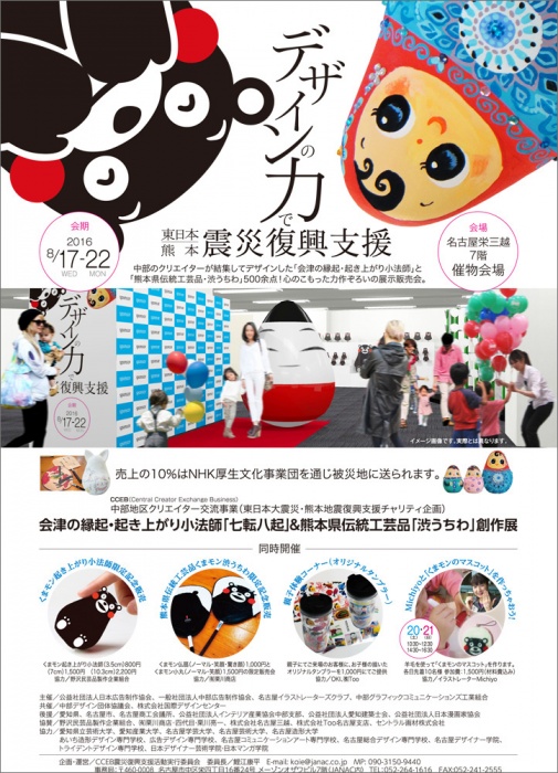 | 共催・後援など | 共催=中部デザイン団体協議会、株式会社国際デザインセンター、後援=愛知県、名古屋市、名古屋商工会議所、公益社団法人インテリア産業協会中部支部、公益社団法人愛知建築士会、公益社団法人日本漫画家協会、協賛=野沢民芸品製作企業組合、有限会社栗川商会・四代目・栗川亮一、株式会社名古屋三越、株式会社Too名古屋支店、セントラル画材株式会社、協力=愛知県立芸術大学、愛知産業大学、名古屋学芸大学、名古屋芸術大学、名古屋造形大学、あいち造形デザイン専門学校、広告デザイン専門学校、名古屋コミュニケーションアート専門学校、名古屋総合デザイン専門学校、名古屋デザイナー学院、トライデントデザイン専門学校、日本デザイナー芸術学院・日本マンガ学院、企画・運営=CCEB震災復興支援活動実行委員会 |