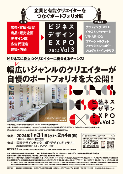 | 問い合わせ先 | 一般社団法人中部広告制作協会 ビジネスデザインEXPO担当理事(株式会社シンクスデザイニングプロ 佐波敬司)info@b-designexpo.com デザインギャラリー(会期中会場専用tel052-265-2126) |
