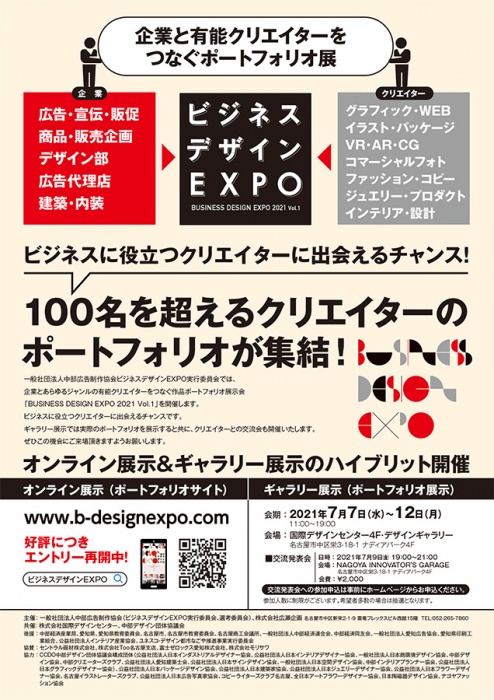 「ビジネスデザインEXPO」は、企業とクリエイターの交流の場としての「ポートフォリオ展示会」と「発表・懇親会」の開催と、企業とクリエイターをつなぐ専用ポータルサイト「b-designexpo.com」の構築により、相互の成長に寄与することを目的に開催。ポートフォリオ展にはフリーランス、法人プロダクション、印刷業界などの一般企業、中部デザイン団体協議会(CCDO)構成団体はじめ、あらゆるジャンルのデザイン関連団体・個人の作品ポートフォリオ約100点が展示の予定。