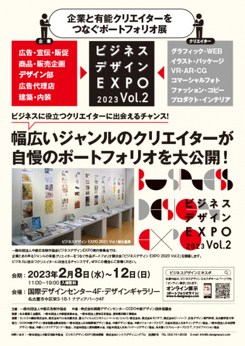 | 問い合わせ先 | ビジネスデザインEXPO実行委員会事務局(一般社団法人中部広告制作協会事務局内)tel052-264-1616、fax052-241-2555、info@b-designexpo.com、デザインギャラリー(会期中会場専用tel052-265-2126) |