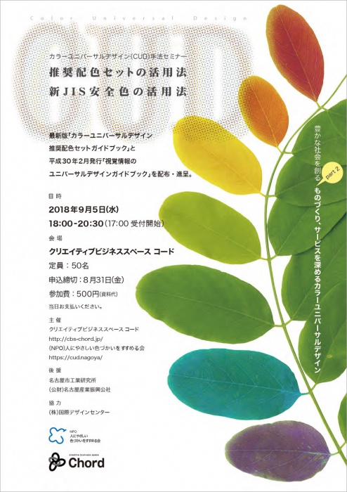| 主催 | クリエイティブビジネススペース コード、NPO法人 人にやさしい色づかいをすすめる会 |
