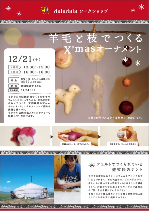 今回、モンゴル、ケニアの伝統的な素材をいかしたオリジナル雑貨を扱うdaladalaが、ワークショップを開催。前回・前々回と好評だった、羊毛から作るフェルトを使ったワークショップで、天然素材のクリスマスオーナメントを作ります。作り手によって揺れる表情もさまざま。モンゴル伝統の塩入ミルクティーも試飲していただけます。