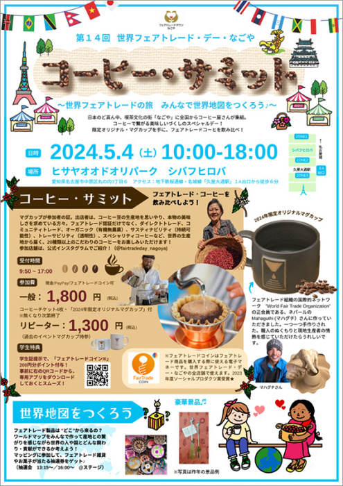 5月の第2土曜日は、“世界フェアトレード・デー”として世界中の各地域でフェアトレード推進イベントが開催されます。今年で14回目を迎える名古屋でも、ヒサヤオオドオリパーク シバフヒロバで、トーク、ワークショップ、コーヒー・サミット(フェアトレードコーヒーの飲みくらべ)、マルシェなど、さまざまなイベントが開かれます。