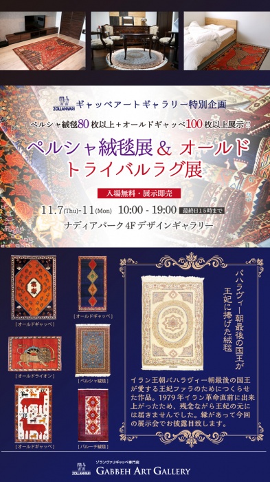 ペルシャ絨毯(80枚以上)、オールドギャッベ(100枚以上)の展示販売。