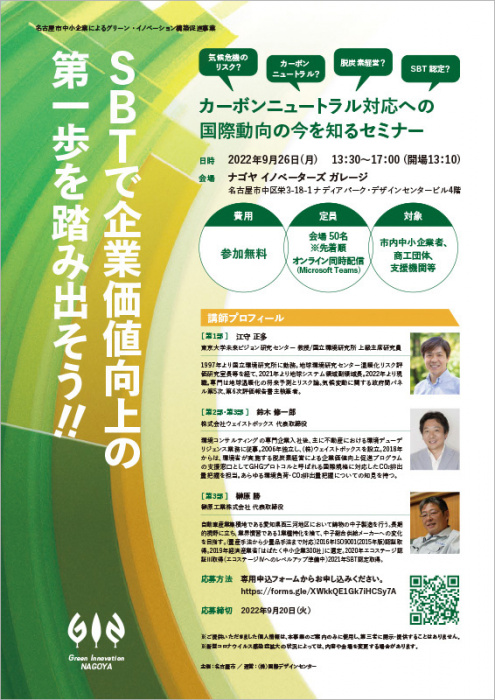 脱炭素社会の実現に向け、名古屋市内の中小企業者がSBT(Science Based Targets)認定についての理解を深め、今後、環境問題に関心の高い大手企業や海外市場と取引を行う上での競争力を高めるきっかけとなるセミナーを開催。基調講演・解説講座・事例紹介の3本立てで、SBT認定取得のメリットや、カーボンニュートラルをはじめとした環境対応が企業に求められている背景・国際的な動向をわかりやすく解説します。