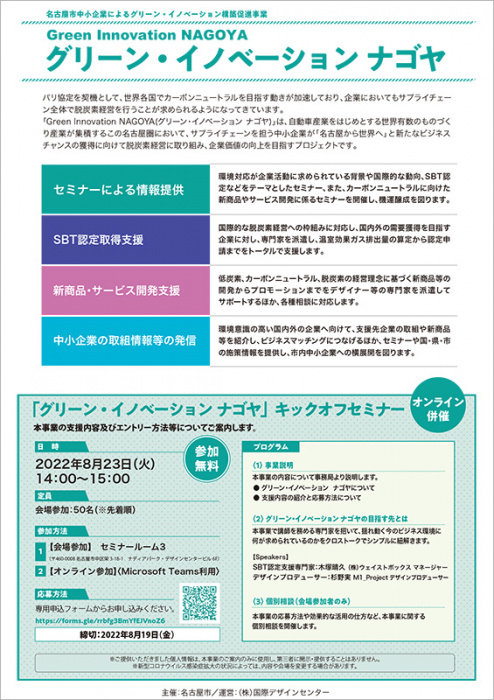 | 問い合わせ先 | 株式会社国際デザインセンター・事業部「グリーンイノベ」係tel052-265-2104 gi-nagoya@idcn.jp |